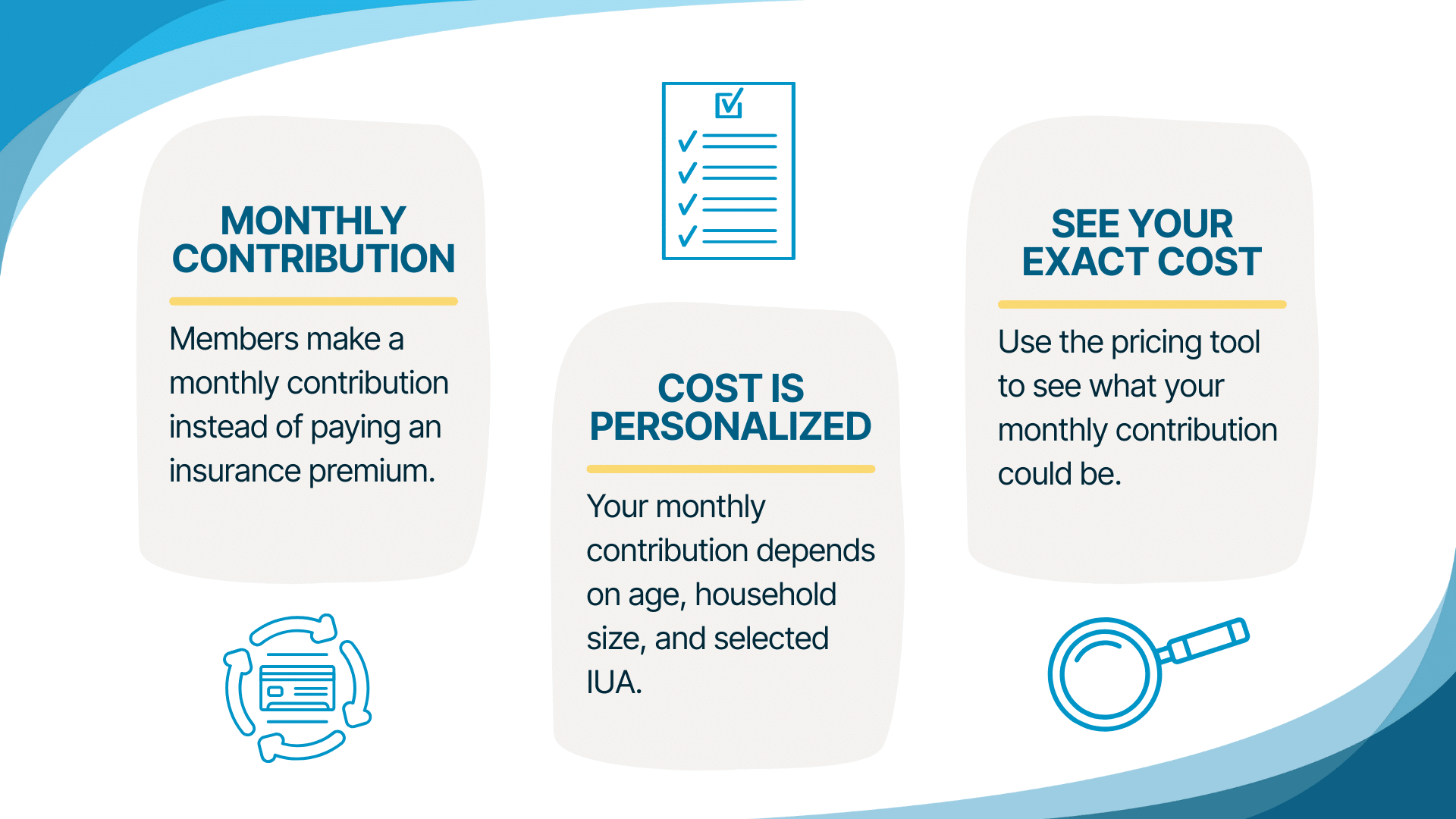 For example, in 2026 a single individual who is 21 years old and selects a $2,500 IUA would contribute $161/month. A 45 year old who is married with children and selects the $5,000 IUA would contribute $504/month. Click here for our membership pricing tool and see what your monthly contribution could be.