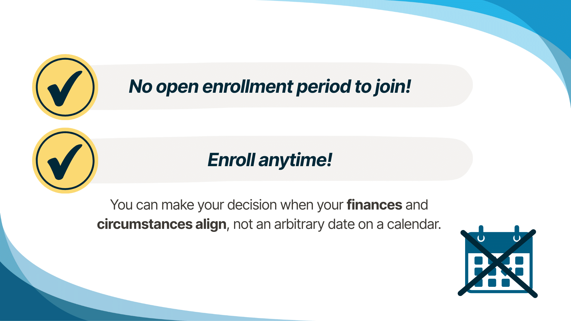 We offer this year round enrollment option because we recognize the restrictive limitations of open enrollment windows being difficult to manage. You can make your decision when your finances and circumstances align, not an arbitrary date on a calendar.