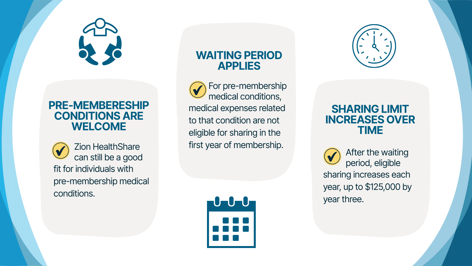 Members with certain pre-membership medical conditions can still join the Zion HealthShare community. Medical expenses related to that condition will not be eligible for sharing in the first year of membership. After this waiting period, the amount eligible for sharing increases with each year of membership, capping at $125,000 after the third year of membership.